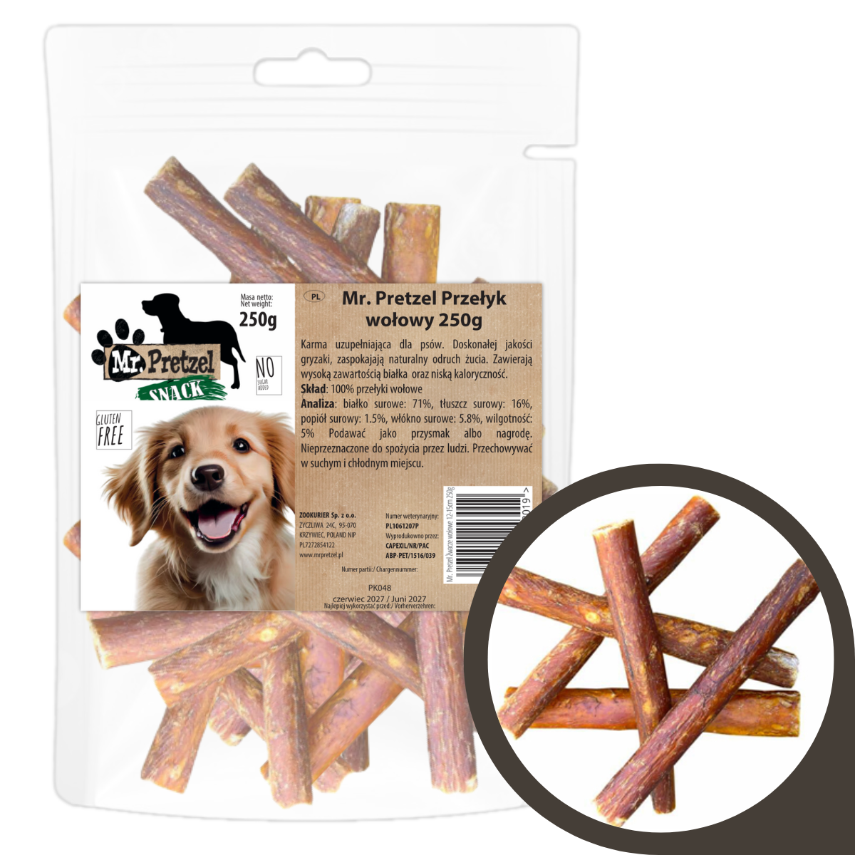 Przełyki wołowe Mr. Pretzel to idealny wybór dla psów o różnych wielkościach i rasach, które uwielbiają naturalne, zdrowe przekąski. Długi termin przydatności zapewnia wygodę przechowywania, a Twój pupil z pewnością doceni ich smak i aromat.