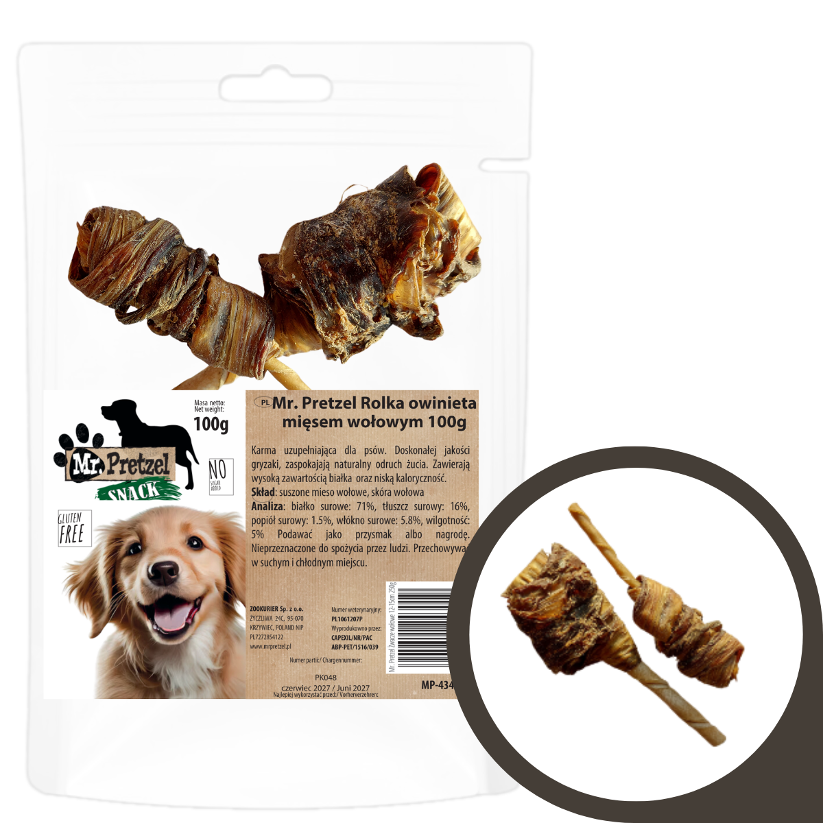 Rolka owinięta mięcem wołowym Mr. Pretzel to idealny wybór dla psów o różnych wielkościach i rasach, które uwielbiają naturalne, zdrowe przekąski. Długi termin przydatności zapewnia wygodę przechowywania, a Twój pupil z pewnością doceni ich smak i aromat.