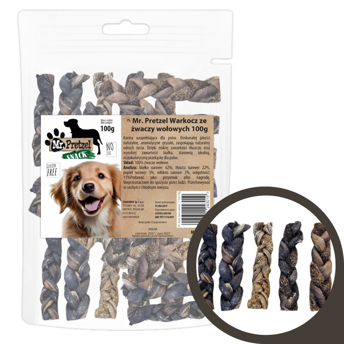 Warkocz ze żwaczy wołowych Mr. Pretzel to idealny wybór dla psów o różnych wielkościach i rasach, które uwielbiają naturalne, zdrowe przekąski. Długi termin przydatności zapewnia wygodę przechowywania, a Twój pupil z pewnością doceni ich smak i aromat.